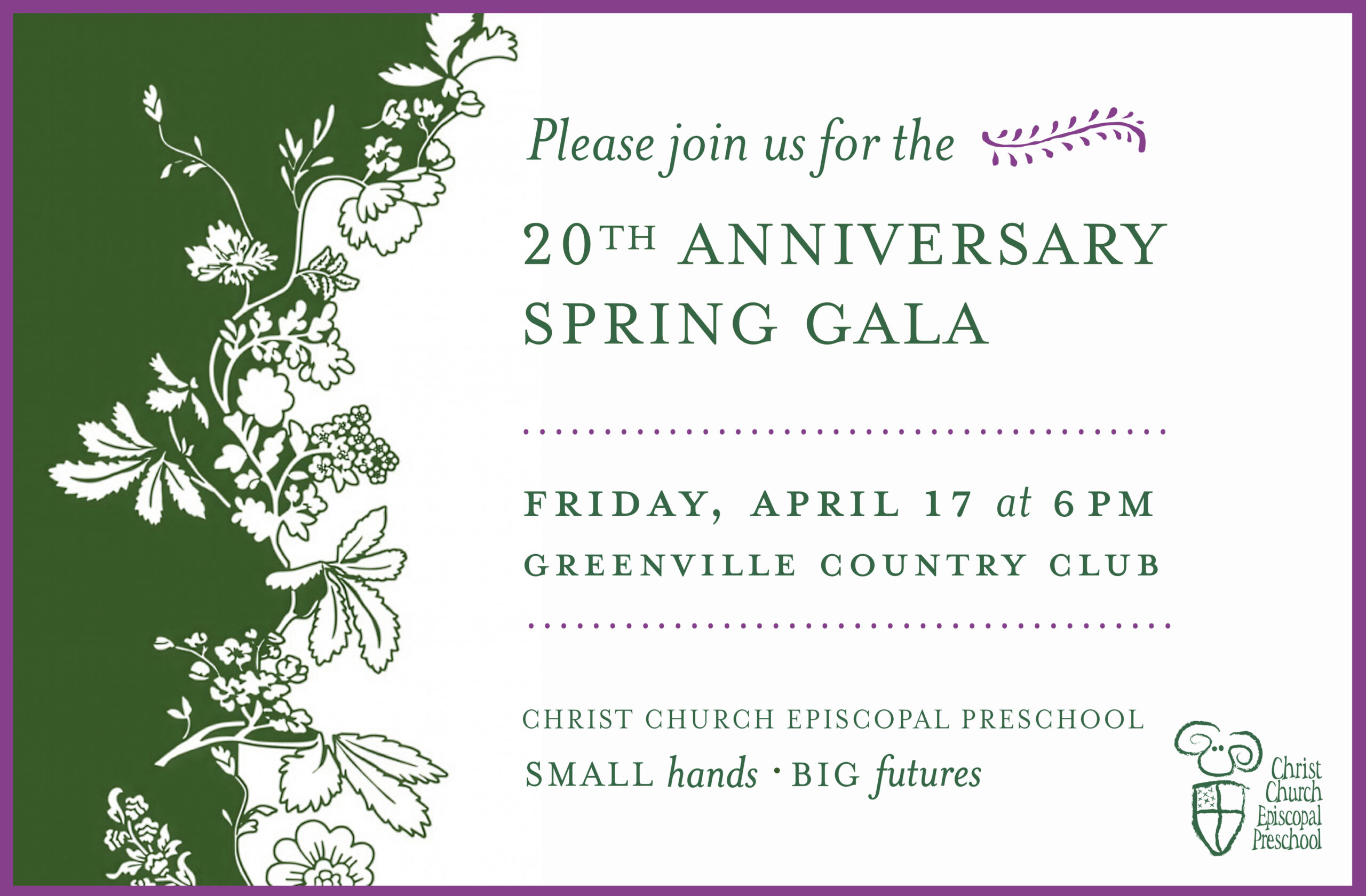 February 26, 2026CCEP’s 20th Anniversary Spring Gala takes place on Friday, April 17, at 6 PM at Greenville Country Club, and all are invited to attend. Join us for this adults-only evening celebrating more than two decades of inspiring young learners and shaping bright futures at Christ Church Episcopal Preschool. Enjoy festive cocktails, exceptional cuisine, and an exciting silent auction before the energy builds for a spirited live auction and paddle raise. As we mark 20+ years of impact, we will gather in celebration of the children, teachers, and families who make CCEP so special—and invest in all that lies ahead. Purchase tickets and explore sponsorship opportunities below. All proceeds support our school programs.